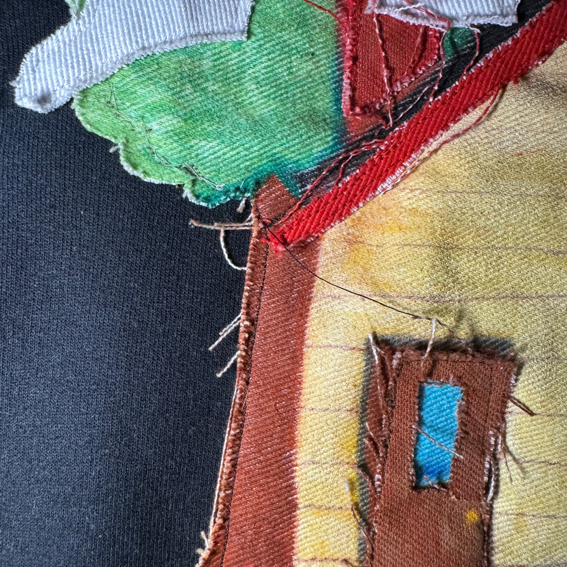 - Front: Hand-embroidered white “HYGH” lettering + handmade 🏠 patch